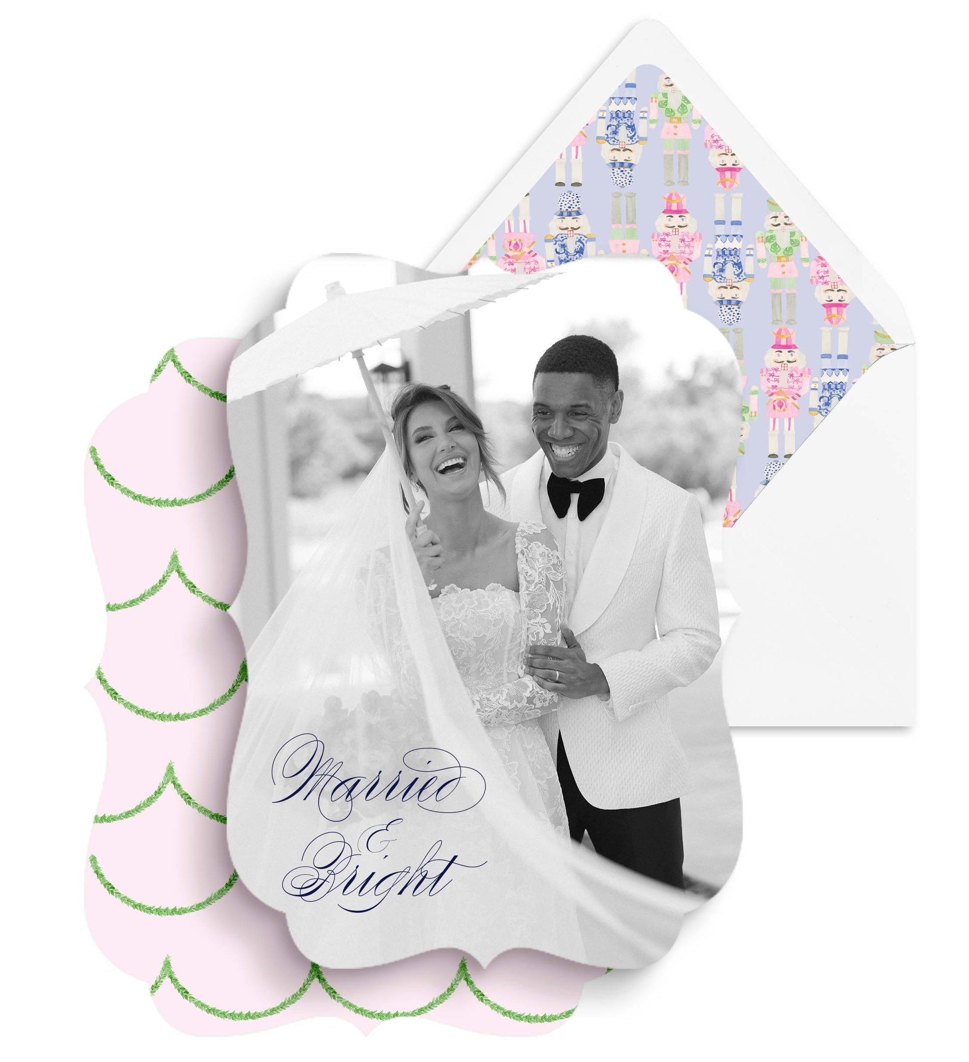 Our best-selling nutcrackers make this cute set! Back of card has green garland with pink background, and the card is cut into a unique antique shape for extra flair