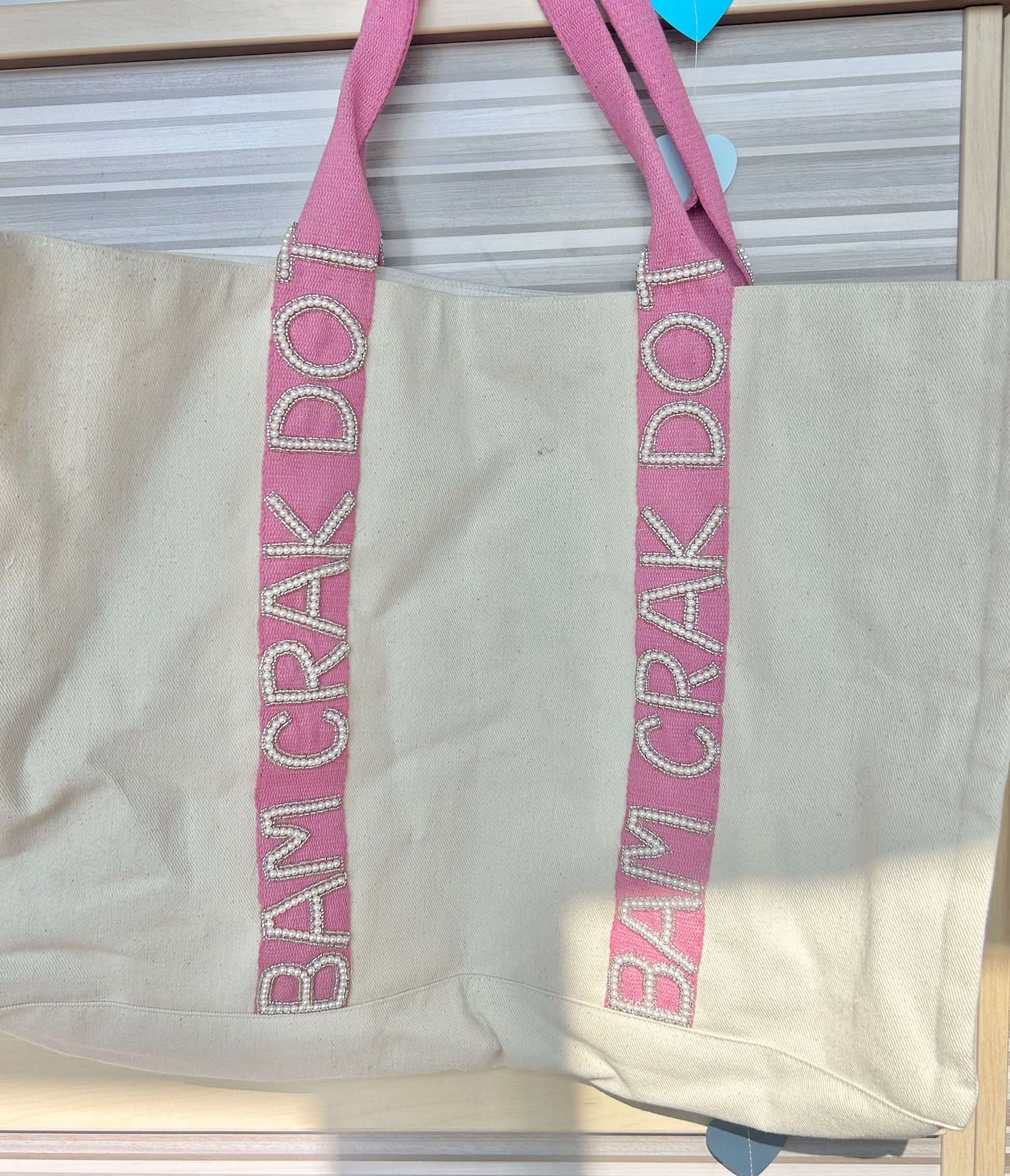 22x15x6" with pink canvas straps and pearl lettering saying BAM CRAK DOT. Satin interior.