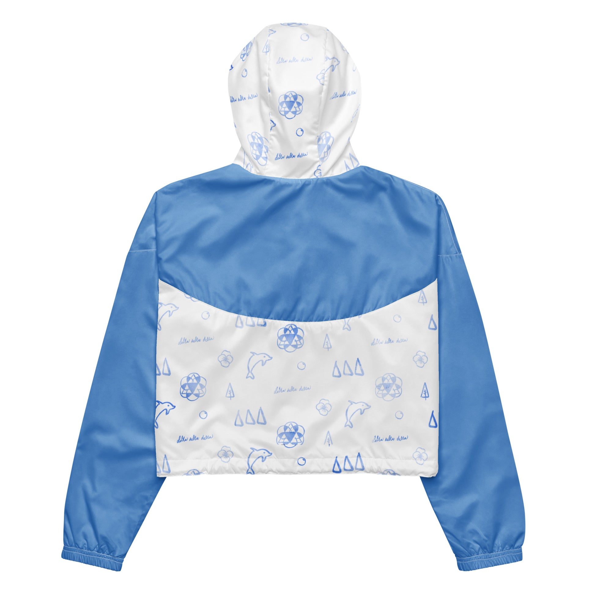 Go greek! Support your house with this one of a kind cropped windbreaker. Hand drawn watercolor print pattern with iconic Delta Delta Delta designs.